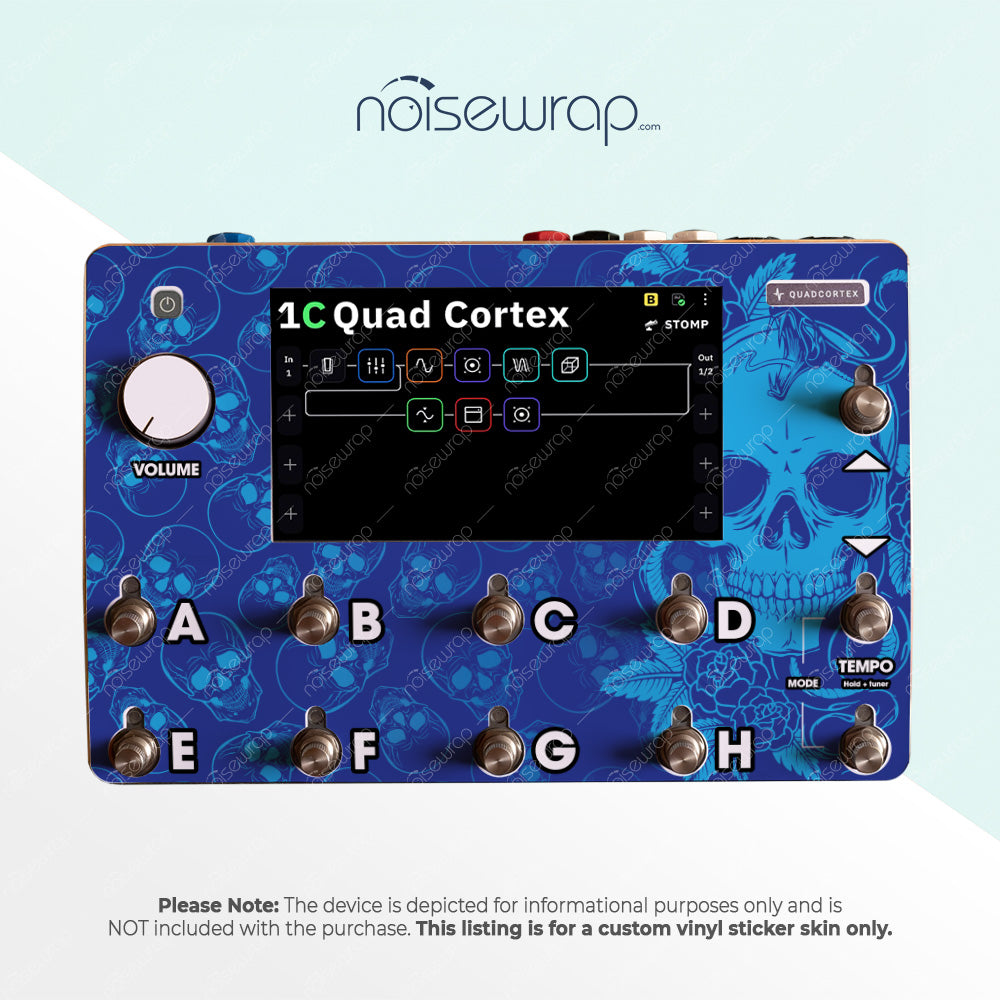 Add some bold edge to your device with the Blue Skull vinyl skin. This striking design features detailed skull illustrations set against a deep blue background, offering a unique and daring aesthetic. Ideal for musicians who want their gear to stand out. Made to fit Quad Cortex device.